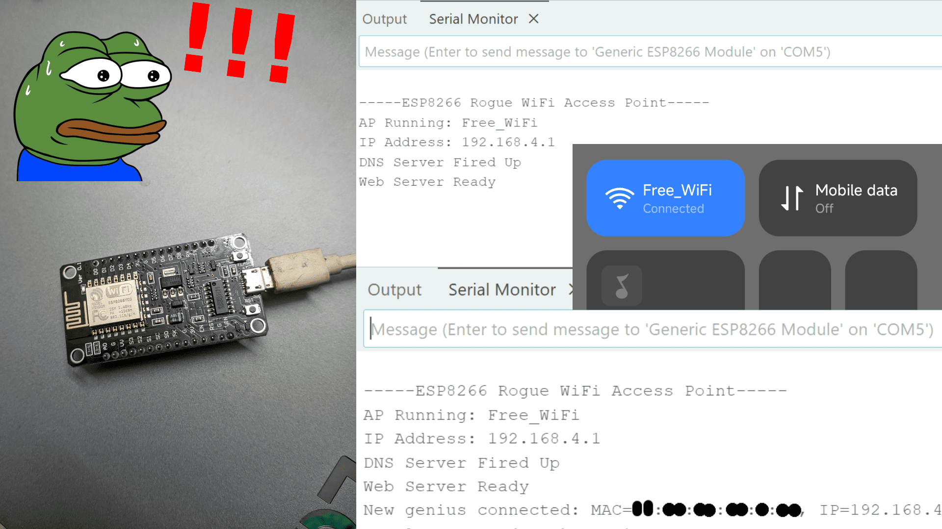 The ESP8266's WiFi radio sends 802.11 beacon frames (management frames that contains info that can be used in wireless networks) advertising as the fake "Free_WiFi". A built-in DHCP server (part of library) hands out IPs to clients, so when someone tries to connect to this "wifi" sending a DHCP request, the ESP's server catches it. The ESP acts as the gateway and DNS server, controlling all traffic.