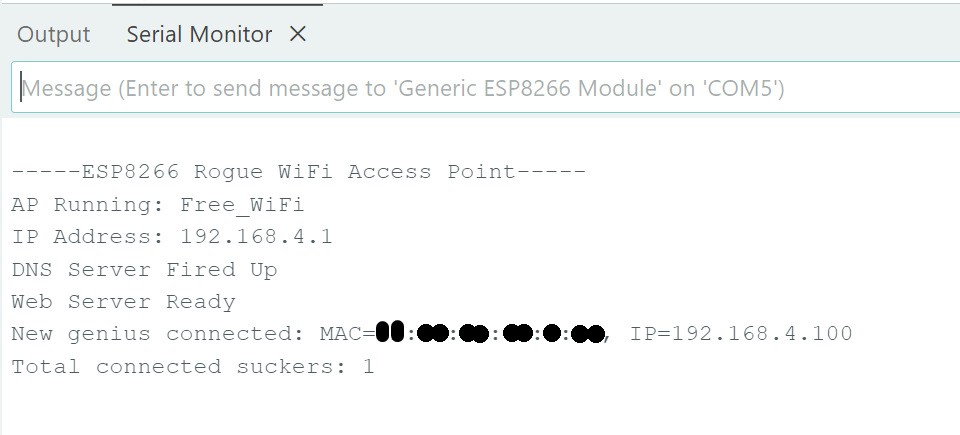 And if you look at the serial monitor, you will see the collected data (MAC address in this case)